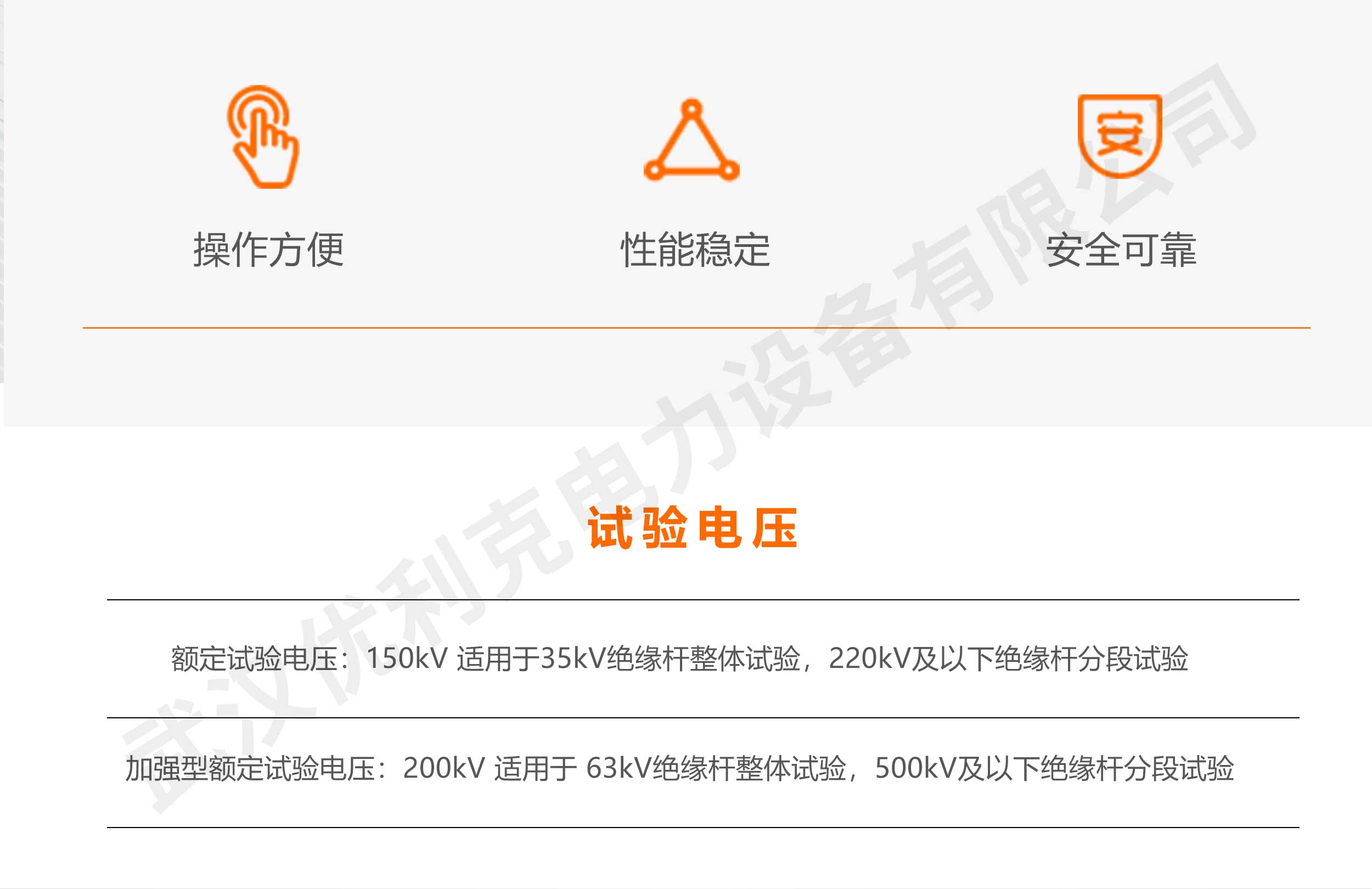 | 試驗(yàn)電壓 | 額定試驗(yàn)電壓:150kV 適用于35kV絕緣桿整體試驗(yàn),220kV及以下絕緣桿分段試驗(yàn) 加強(qiáng)型額定試驗(yàn)電壓:200kV 適用于 63kV絕緣桿整體試驗(yàn),500kV及以下絕緣桿分段試驗(yàn) |