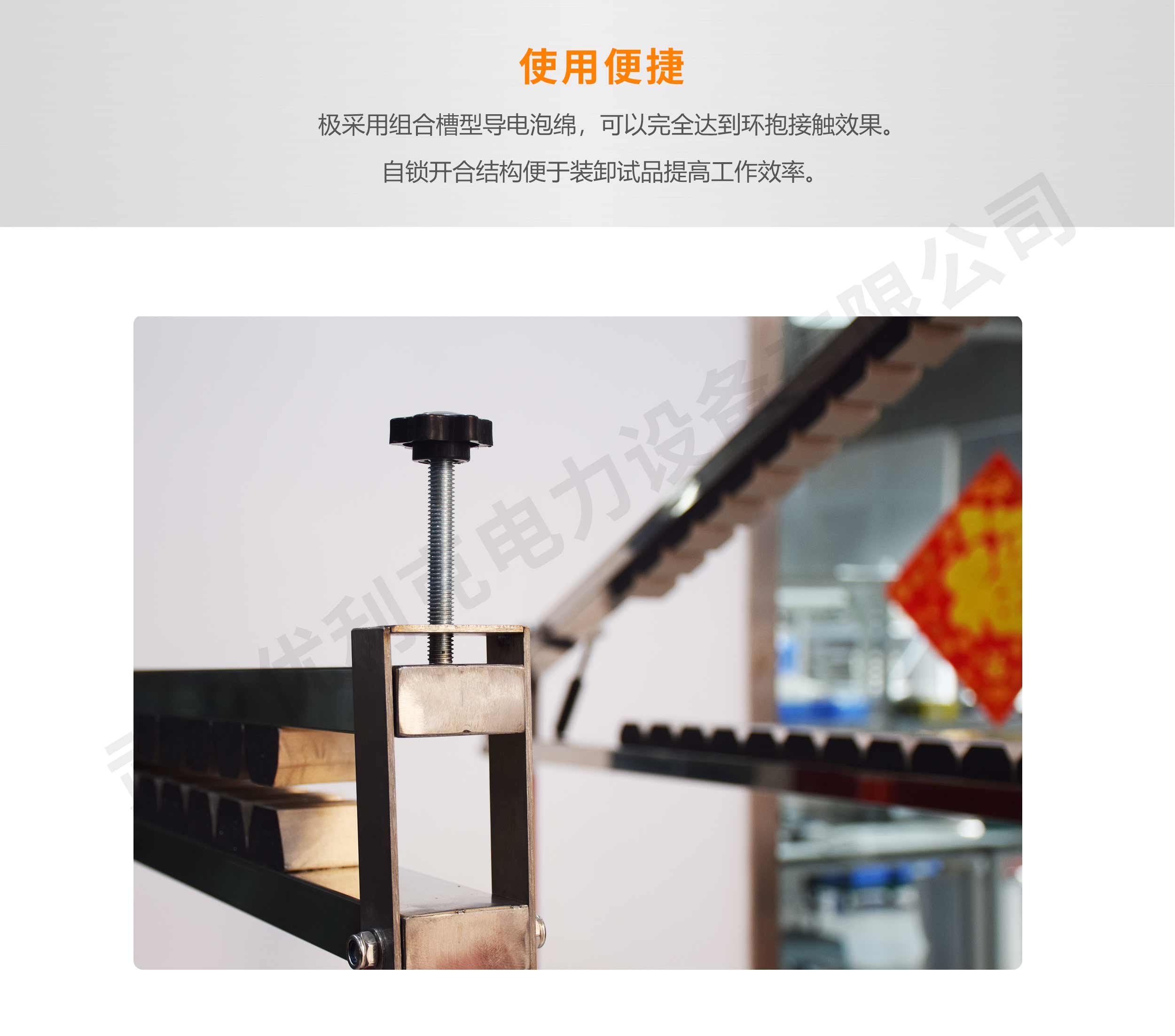 3、極采用組合槽型導(dǎo)電泡綿,可以完全達(dá)到環(huán)抱接觸效果。自鎖開合結(jié)構(gòu)便于裝卸試品提高工作效率。