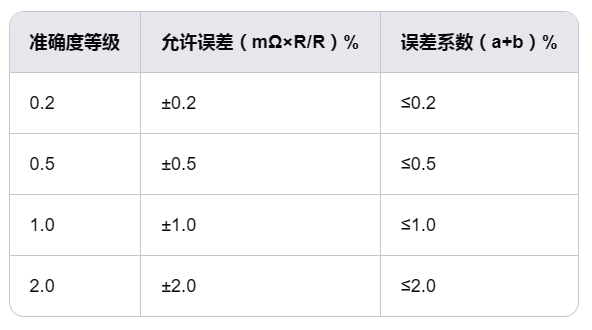 根據標準,回路電阻測試儀的準確度等級和允許誤差如下表所示: